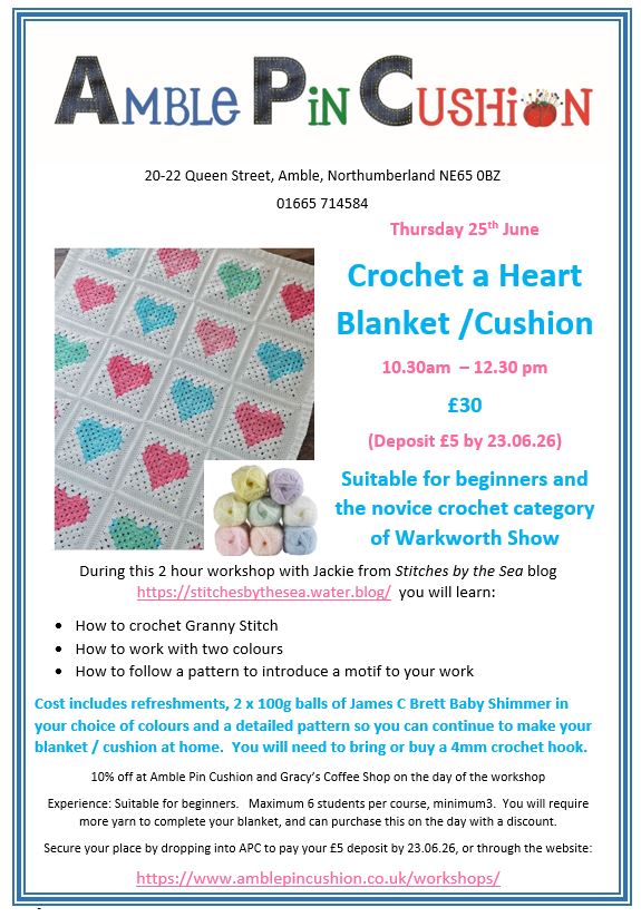 10% off at Amble Pin Cushion and Gracy’s Coffee Shop on the day of the workshop