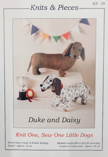 The knitted dog is created in double knitting yarn on 3mm needles, and the sewn dog can be made in any weight or design of fabric