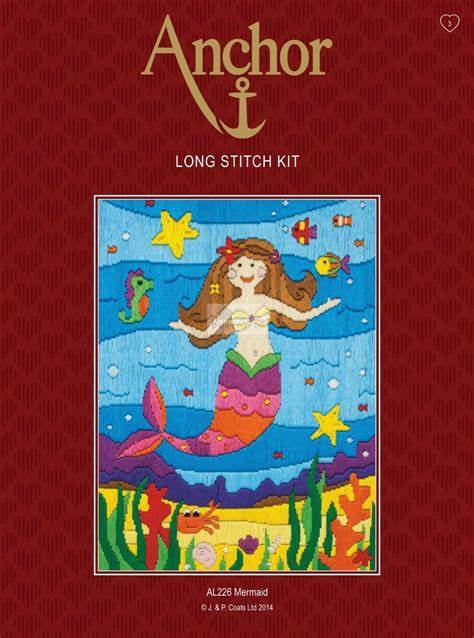 This kit contains instructions, needle, printed canvas and stranded cotton threads to complete 1 mermaid long stitch.