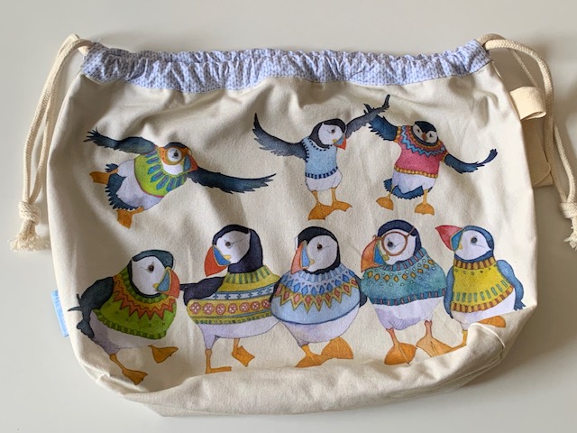 Drawstring bag with eight comical puffins all wearing patterned knitted jumpers
